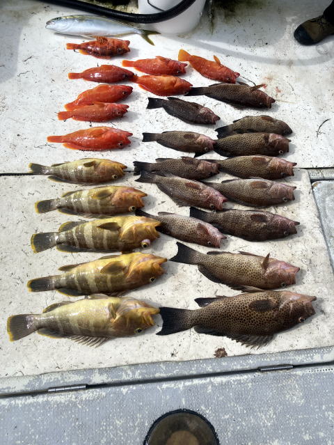1ヵ月ぶりのタイラバ船でした 1人船酔いで戦闘能力0でした。 初挑戦の女性の方がオオモンハタ 10匹とアオハタ3匹やアカハタ 釣りまくってました。 キハダふかせは今日はそこそこ 数は釣れてましたし船も遠くの場所に 昨日すごく釣れたので半分25隻以上2時間以上走って 行ったので潮岬は船は半分だったので 確率もよかったようです。 |